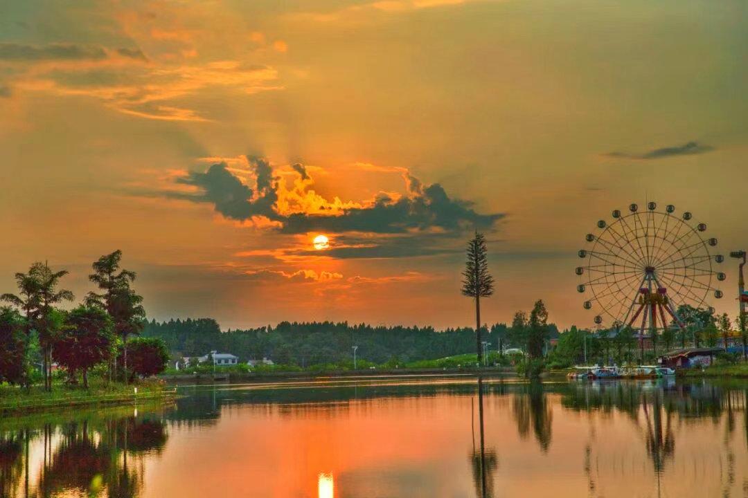 作品简介:2020年9月3日清晨到安岳县宝森柠檬小镇摄影,遇到日出、摩天轮和湖面构成一幅和谐画面,天空橙黄、湖面金红,营造出温馨浪漫氛围。