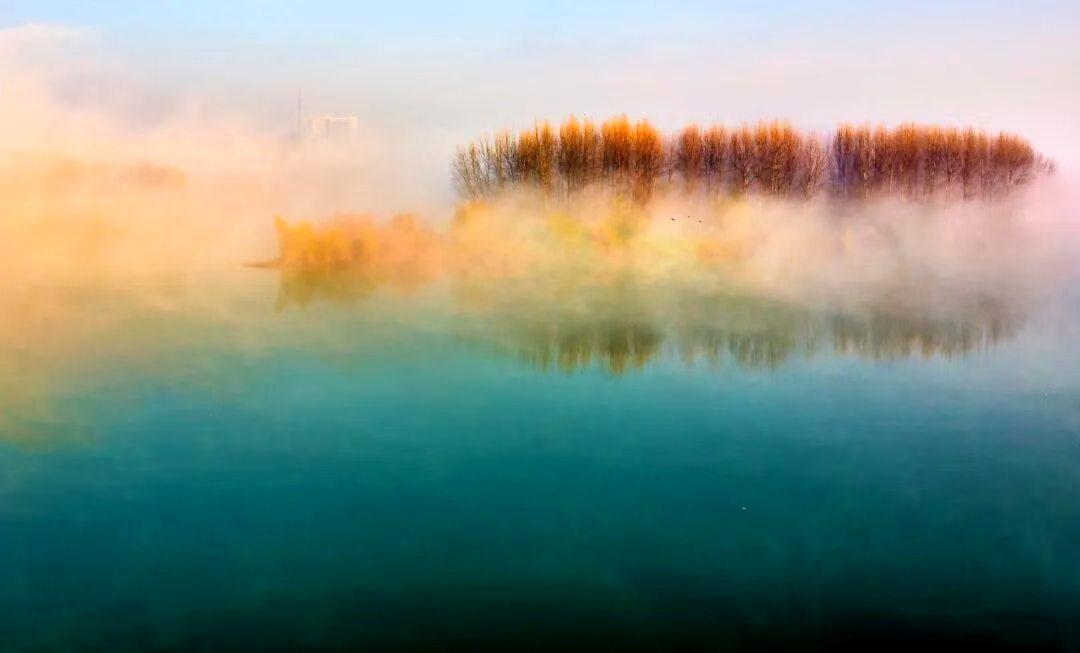 作品简介:沱江河资阳城区段云雾撩绕,河流、树木、城市建筑若隐若现,温暖的阳光照耀在河心小岛金色的树梢和碧绿的河面上,水鸟腾飞、景色迷人。