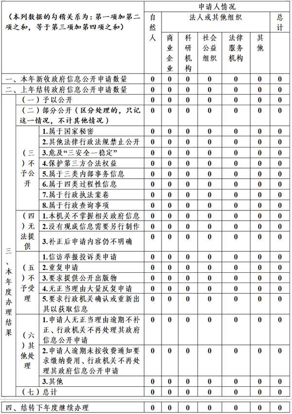 全年未收到政府信息公开申请。无上年结转政府信息公开申请或结转下年度继续办理情况。全年未发生政府信息公开行政复议和行政诉讼办理事项。