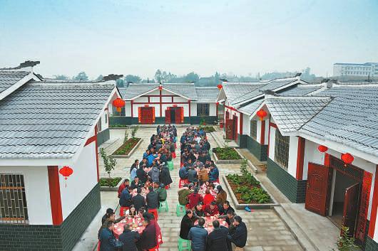 2017年,广安市广安区白马乡白马村易地扶贫集中安置点贫困群众与前来贺喜的亲朋好友集体过春节。