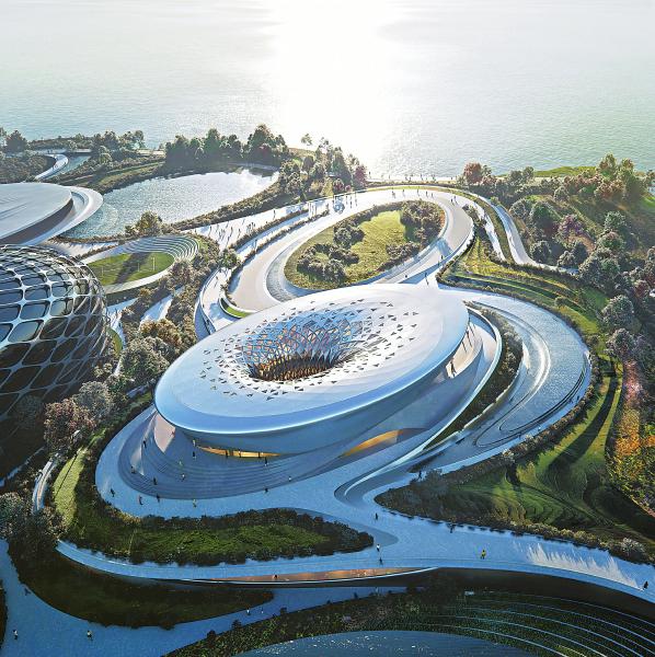 位于天府新区兴隆湖畔的独角兽岛概念图。扎哈·哈迪德建筑事务所供图