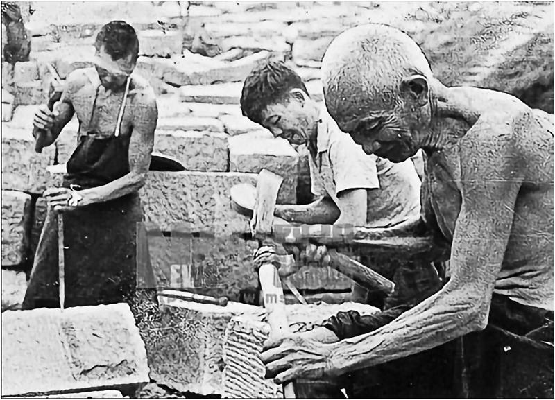 在黑龙滩水库建设现场,工人在打条石。(本文供图:黑龙滩灌区管委会、仁寿县委宣传部)