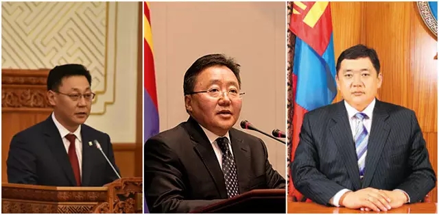 (资料图:从左至右依次为:蒙古国总理额尔登巴特;蒙古国总统额勒贝格道尔吉;蒙古国国家大呼拉尔主席恩赫包勒德)