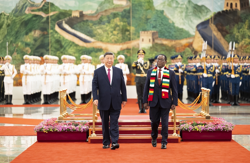 9月3日下午,国家主席习近平在北京人民大会堂同来华出席中非合作论坛北京峰会并进行国事访问的津巴布韦总统姆南加古瓦举行会谈。这是会谈前,习近平在人民大会堂北大厅为姆南加古瓦举行欢迎仪式。新华社记者 殷博古 摄
