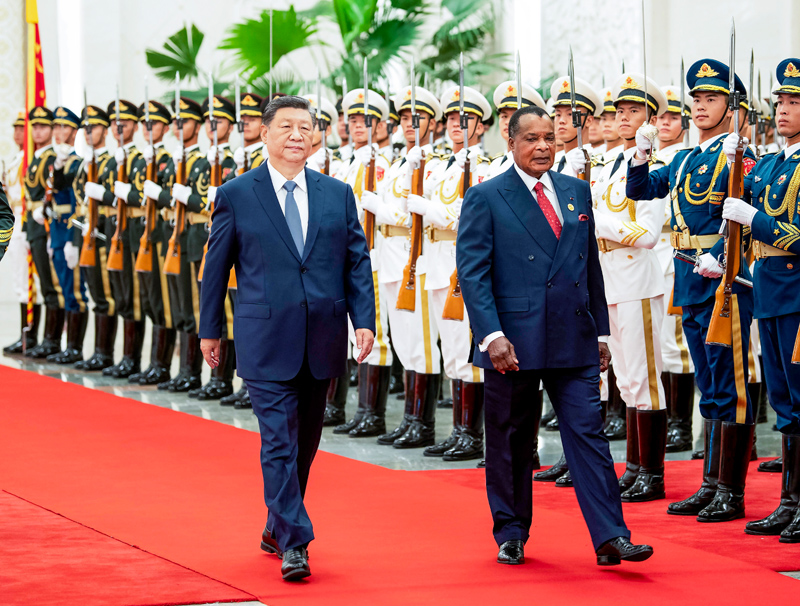 9月6日上午,国家主席习近平在北京人民大会堂同来华出席中非合作论坛北京峰会并进行国事访问的刚果(布)总统萨苏举行会谈。这是会谈前,习近平在人民大会堂北大厅为萨苏举行欢迎仪式。新华社记者 姚大伟 摄