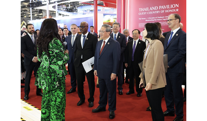 开幕式前,李强参观了企业展。开幕式后,李强同与会外国领导人共同巡馆。