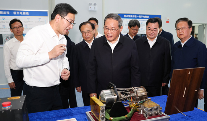 9月15日至16日,中共中央政治局常委、国务院总理李强在甘肃、青海调研。这是9月15日在甘肃兰州,李强来到空间技术物理研究所航天高新产业园,观看最新设备和零部件展示,详细了解相关技术原理和产品产销应用情况。新华社记者 黄敬文 摄