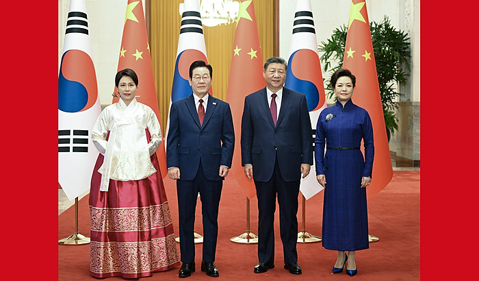 1月5日下午,国家主席习近平在北京人民大会堂同来华进行国事访问的韩国总统李在明举行会谈。这是会谈前,习近平在人民大会堂北大厅为李在明举行欢迎仪式。新华社记者 申宏 摄