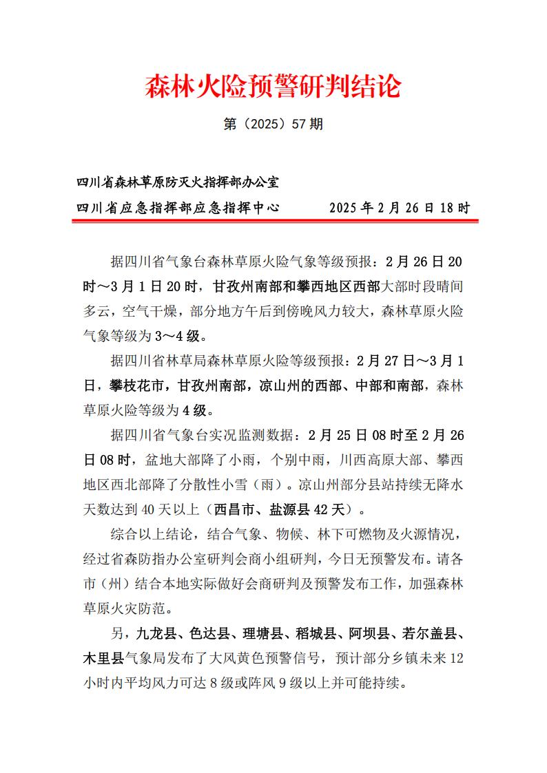 森林火险预警研判结论第(2025)57期