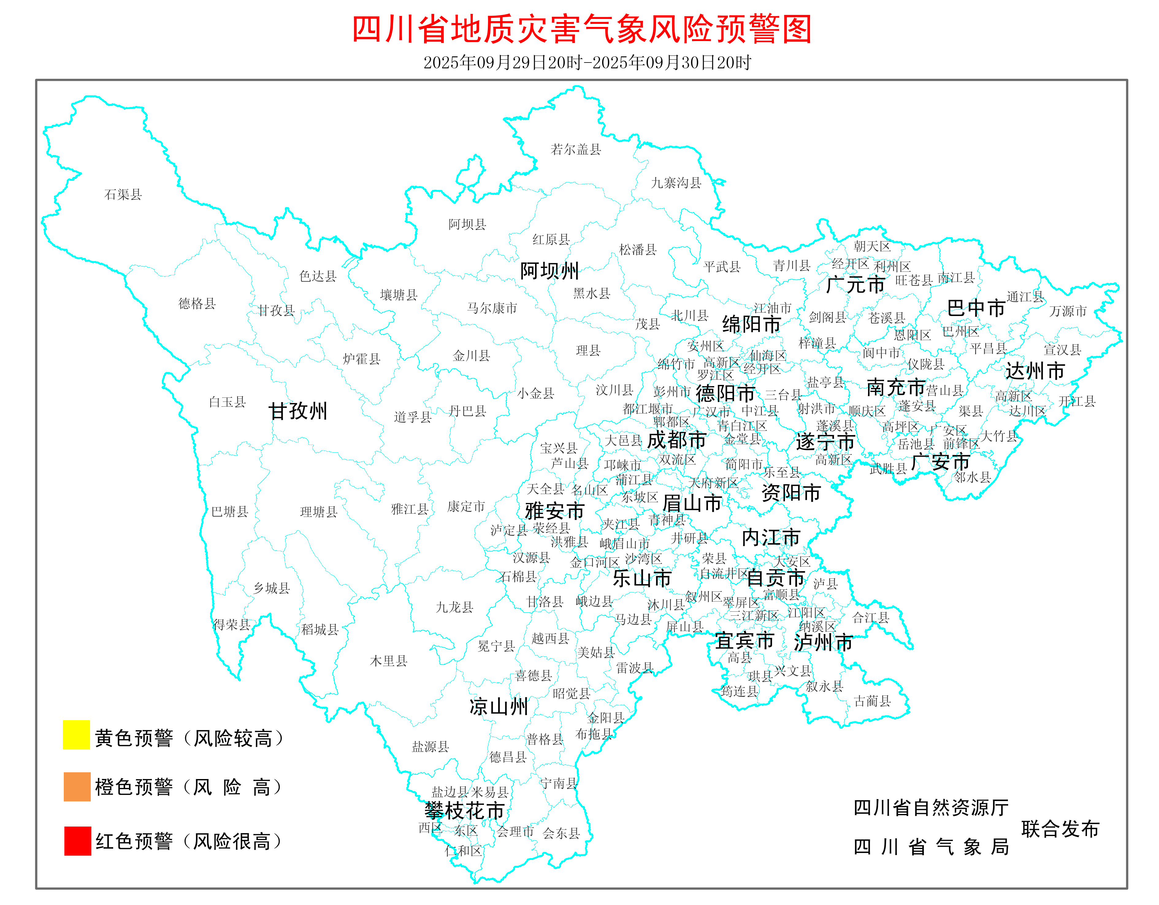 2025年09月29日20时-2025年09月30日20时,无省级地质灾害预报区。请各地结合当地气象部门天气预报和降雨实况,及时发布预警信息,做好地质灾害防范工作。