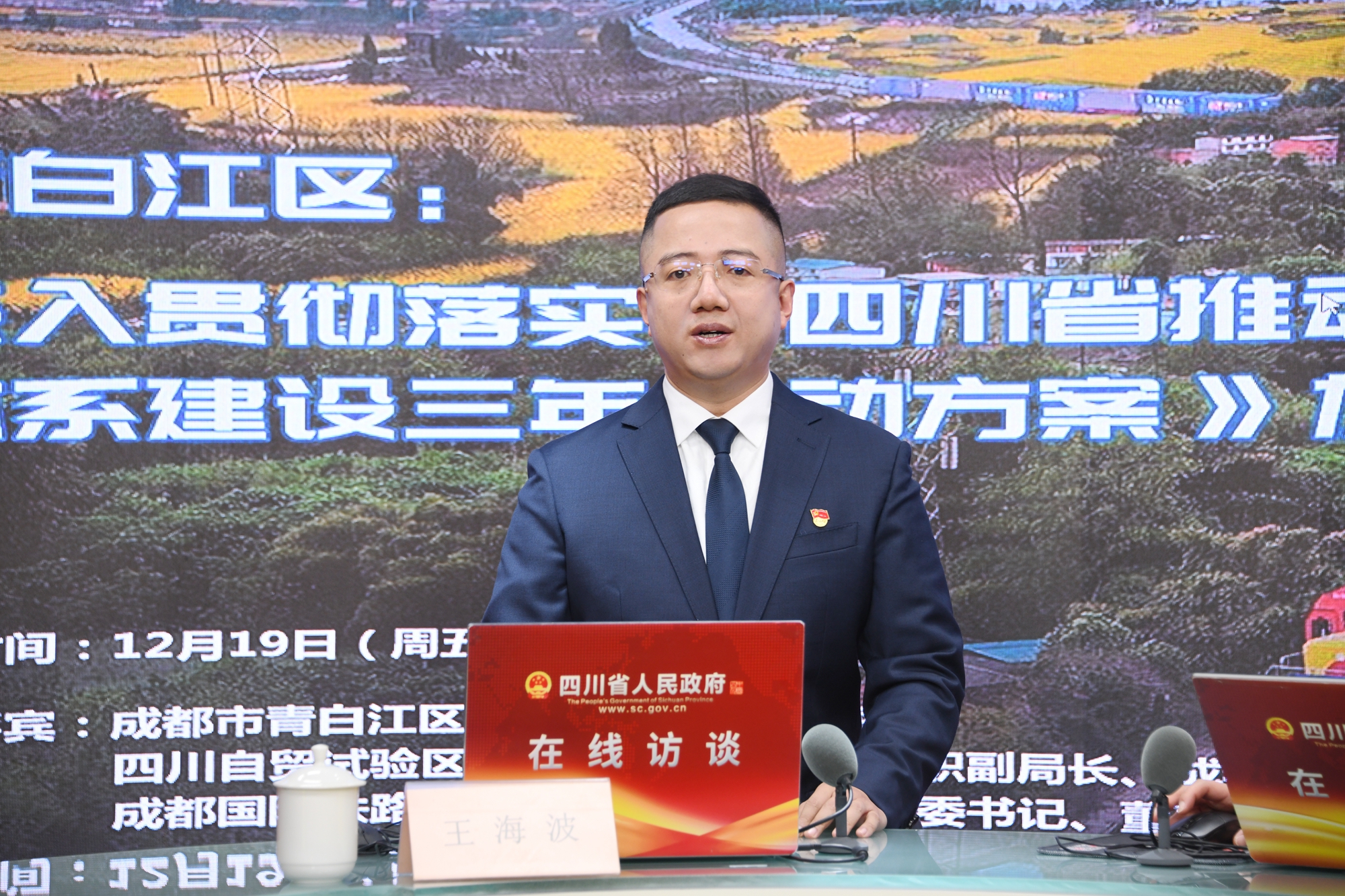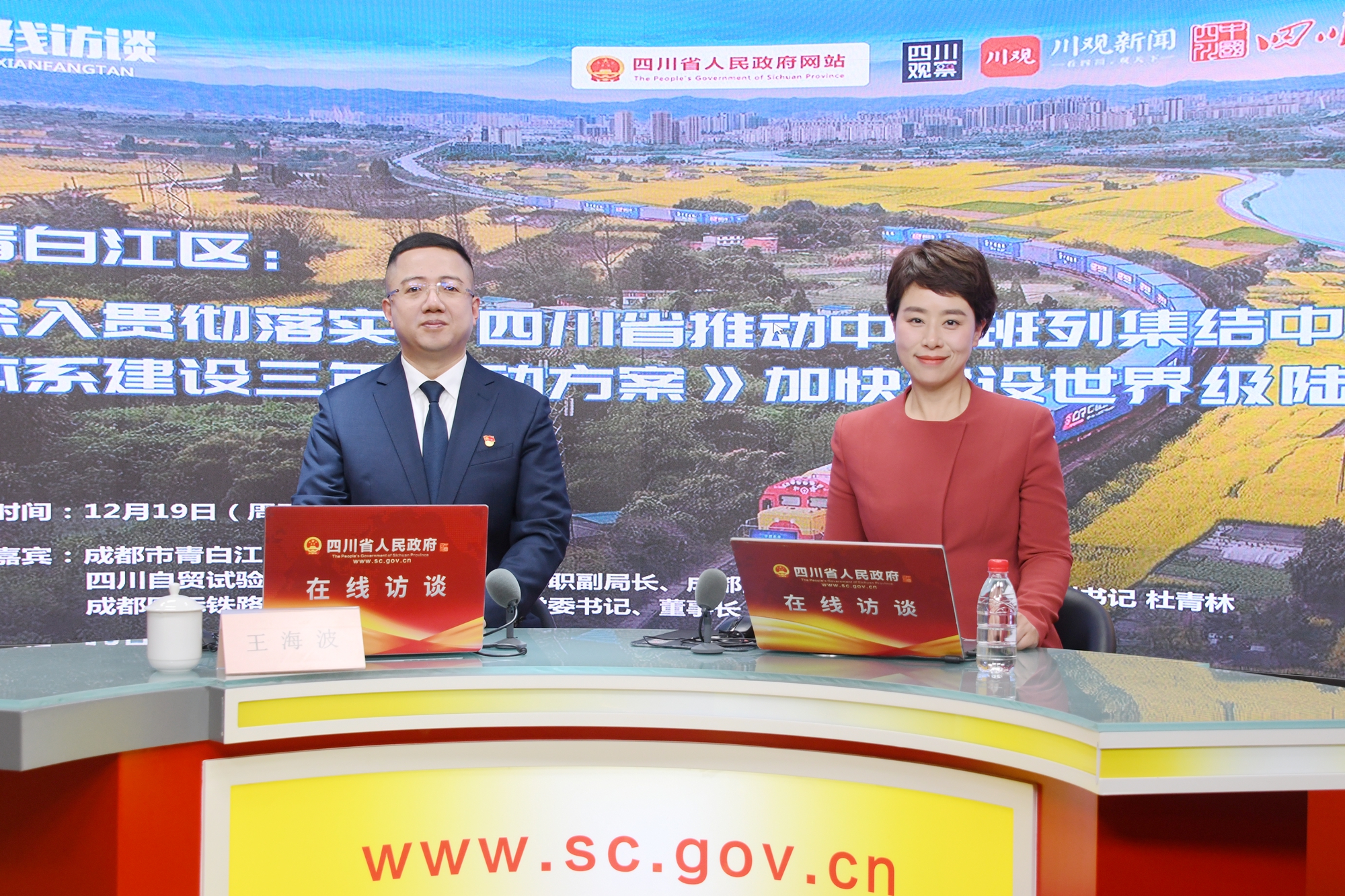为了让广大网友更加深入了解《行动方案》的具体实效,我们邀请到成都市青白江区人民政府区长王海波,四川自贸试验区青白江片区管理局专职副局长、成都国际铁路港经开区党工委副书记杜青林,成都国际铁路港投资发展有限公司党委书记、董事长庞建华,一起走进青白江,并与广大网友进行在线交流。今天的访谈将联合四川观察、川观新闻、四川发布、封面新闻、政策翻译机等平台同步直播,欢迎大家在收看访谈的过程当中积极参与访谈互动。首先有请三位嘉宾给网友们打个招呼!