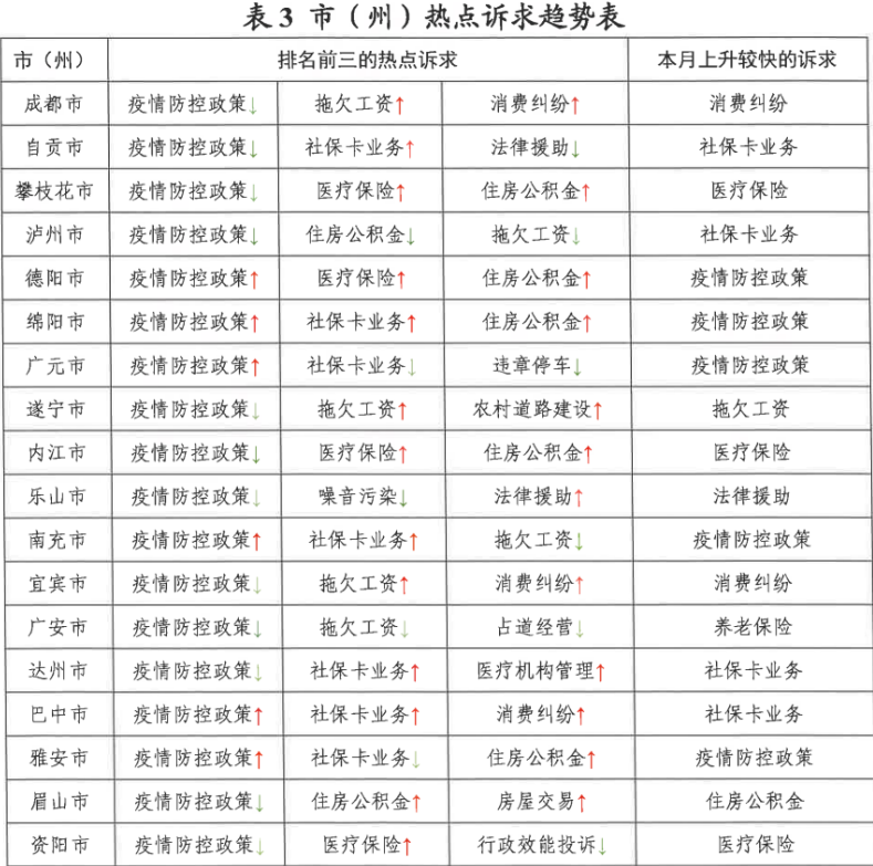 从群众诉求情况来看,疫情防控政策、教培机构、旅游景区服务与管理等诉求较多。绵阳市、广元市、南充市、眉山市等市(州)出现疫情,部分群众对各市(州)疫情防控政策、隔离封控区生活物资采购方式、特殊病人就医渠道、健康码异常申诉等问题诉求量仍较高;因教培机构退费难、未按合约完成教学内容、违规办学等问题导致教培机构类诉求量较多;国庆长假迎出行高峰,部分群众对景区疫情防控政策、游览路线及内容、门票费用等问题诉求量环比上升较大。(见表3)