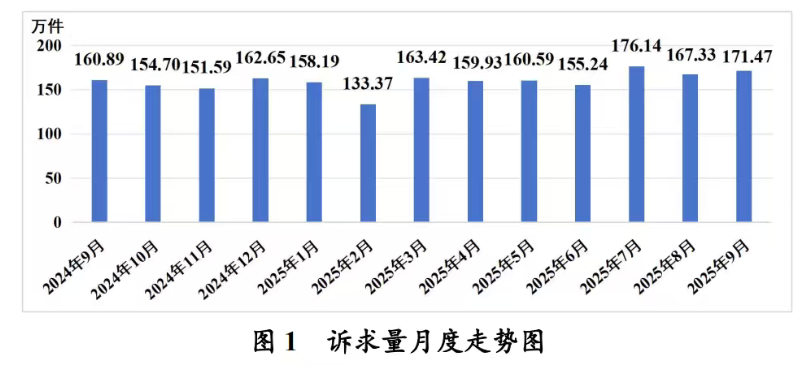 9月,全省12345热线共受理企业群众诉求171.47万件,环比上升2.48%,办结157.80万件,办理中13.67万件,超期率0.01%。见图1。