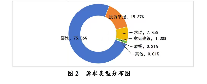 省 12345 热线共受理企业群众诉求89477件,办结81516件,办理中7961件。从诉求类型来看,咨询类占75.36%,投诉举报类占15.37%,求助类占7.75%,意见建议类占1.30%,表扬类占0.21%,其他类占0.01%。见图2。