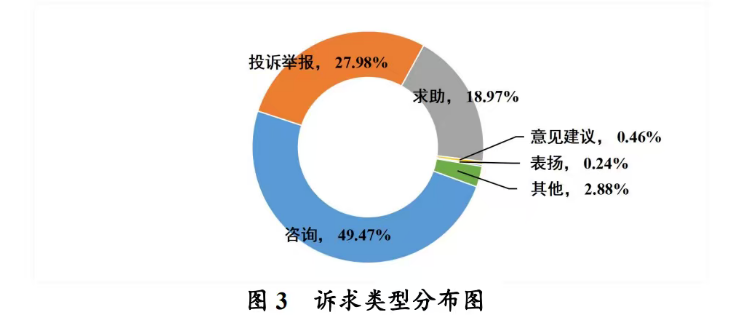 市(州)12345 热线共受理企业群众诉求162.53万件,办结149.64万件,办理中12.88万件。从诉求类型来看,咨询类占49.47%,投诉举报类占27.98%,求助类占18.97%,意见建议类占0.46%,表扬类占0.24%,其他类占2.88%。见图3。
