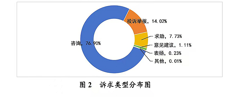 省12345热线共受理企业群众诉求90082件,办结84289件,办理中5793件。从诉求类型来看,咨询类占76.90%,投诉举报类占14.02%,求助类占7.73%,意见建议类占1.11%,表扬类占0.23%,其他类占0.01%。见图2。