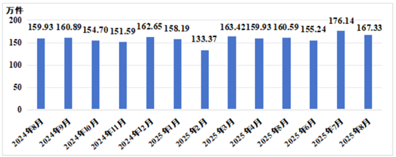 8月,全省12345热线共受理企业群众诉求167.33万件,环比下降5.00%,办结146.56万件,办理中20.77万件,超期率0.01%。见图1。