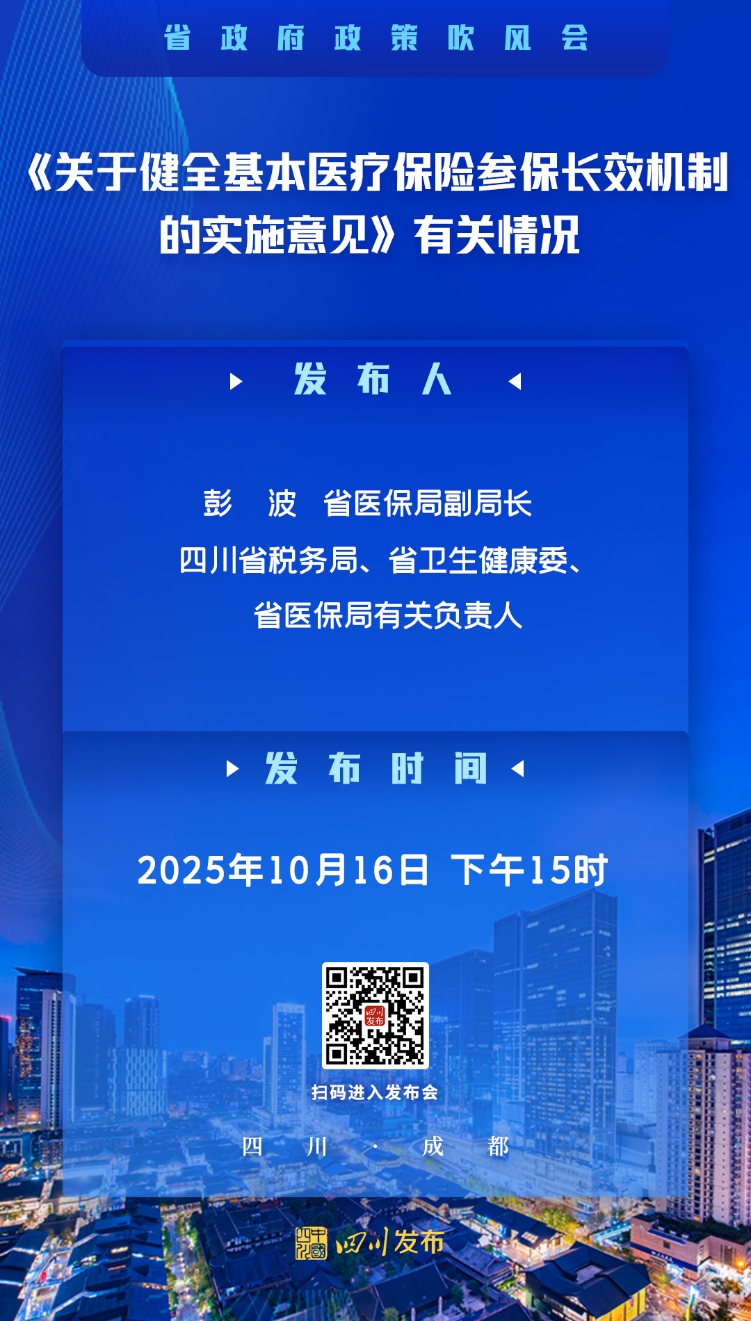 2025年10月16日(星期四)15:00,省政府新闻办在四川新闻发布厅举行政策吹风会,省医保局副局长彭波和四川省税务局、省卫生健康委、省医保局有关负责人介绍《关于健全基本医疗保险参保长效机制的实施意见》有关情况,并答记者问。