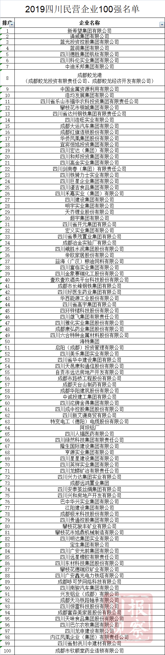 9月4日,省工商联发布“2019四川民营企业100强”榜单及“调研分析报告”。
