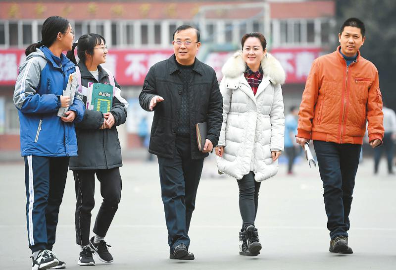 1月8日,在四川省南充高级中学,涂刚代表(中)和师生一起交流。