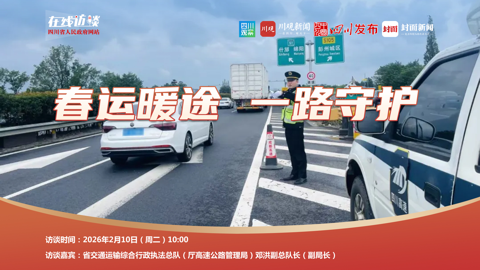 为保障广大群众安全便捷舒适出行,2月10日(周二)10:00,省交通运输综合行政执法总队(厅高速公路管理局)邓洪副总队长(副局长)将做客省政府网站“在线访谈”栏目,围绕“春运暖途 一路守护”主题与广大网友进行交流,敬请关注。