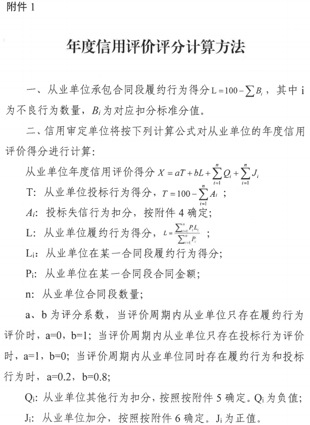 第二十四条 信用评价单位对从业单位承包合同段的履约行为按本办法第二十六条规定进行年度信用评价,并给予合同段年度信用评分。信用审核单位对从业单位承包合同段的履约行为信用评价结果进行审核。信用审定单位根据从业单位在各合同段的年度信用评价进行评分。年度信用等级和信用综合得分计算方法详见附件1。