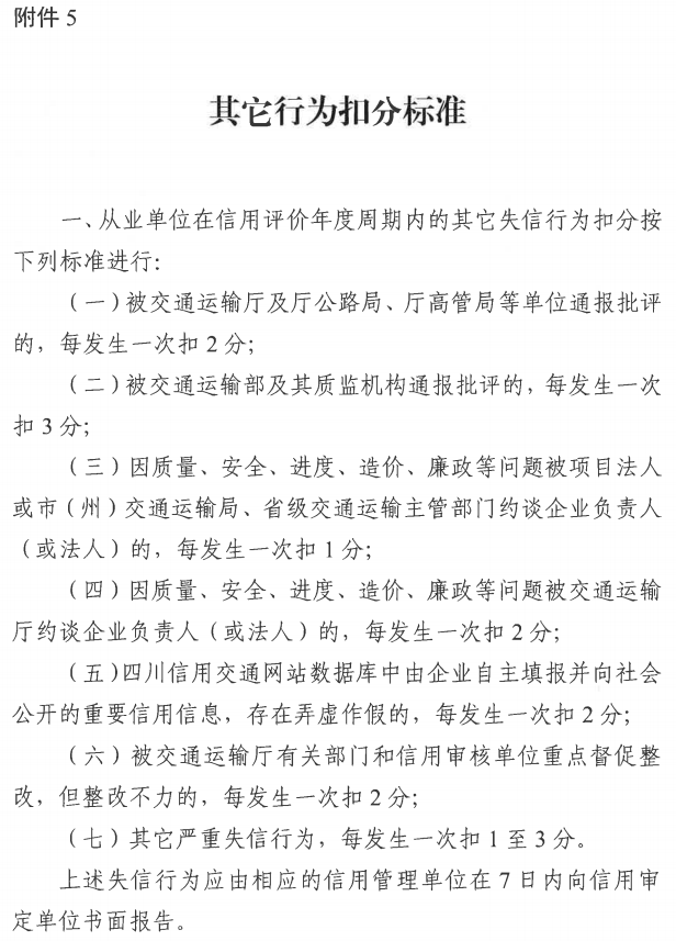 第二十八条 投标失信行为扣分、其它行为评分标准分别详见附件4、附件5。信用评价单位、审核单位应及时将从业单位发生的投标失信行为、其它行为向审定单位报告。信用审定单位按附件4、附件5的规定对从业单位发生的投标失信行为、其它行为实时进行信用记分,并纳入年度信用评价。