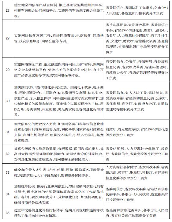 1.加快完善信息网络基础设施。加强全省信息基础设施统筹规划和共建共享。依托成都国家级互联网骨干直联点,统筹优化宽带信息网络布局,完善骨干网、城域网和接入网。深入推进“光网四川”建设,推动城乡光纤网络覆盖和扩容提速。加快建设“无线四川”,推动移动通信网络升级,扩大高速无线局域网覆盖范围。推进宽带网络提速降费,完善电信普遍服务机制,提高老少边穷地区信息服务能力,缩小“数字鸿沟”。推进下一代互联网技术的研发与应用,支持成都建设国家下一代互联网示范城市。全面推进三网融合,加快有线广播电视网、地面数字电视网、调频广播覆盖网和卫星地球站新建、改造,建设下一代广播电视网络和有线无线卫星融合网。构建“高清四川”,加强家庭智慧视听节点建设。加快电子政务外网升级改造,加快向乡镇(街道)、村(社区)延伸,进一步扩大网络覆盖范围;全力推动电子政务内网建设,有效保障网络安全运行,积极开展电子政务内网应用系统建设;有力推动各类业务专网向电子政务内网或外网整合。