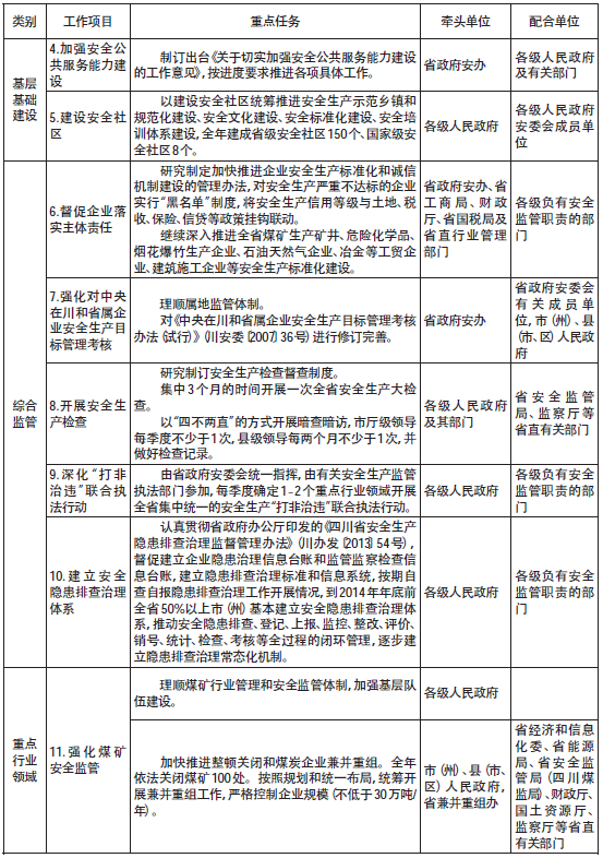 《2014年四川省安全生产工作重点任务分解表》(以下简称《分解表》)已经省政府领导同志同意,现印发给你们,请按照《分解表》要求,对涉及本地区(单位)的任务进一步分解细化,制订具体措施,明确进度安排,认真抓好落实。对涉及多个部门(单位)的工作,牵头部门要负总责,强化沟通协调,其他有关部门(单位)要积极配合,形成工作合力,推进工作落实。
