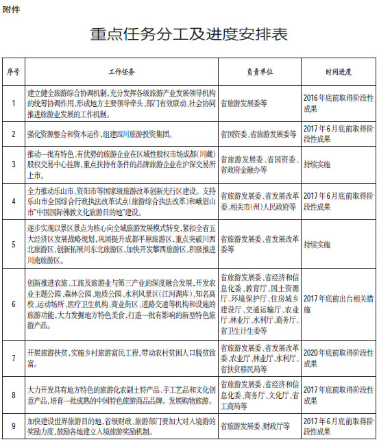 (六)加快旅游改革创新试点。推动乐山市、资阳市等国家级旅游改革创新先行区建设。支持乐山市全国综合行政执法改革试点(旅游综合执法改革)和峨眉山市“中国国际佛教文化旅游目的地”建设。稳妥推进成都线上线下导游自由执业试点工作。攀枝花、乐山、广元、雅安、凉山、阿坝、甘孜和都江堰等全国全域旅游示范区要把推进全域旅游作为新时期促进旅游业改革发展的重要突破口,加快旅游业管理体制和执法机制改革创新,鼓励有条件的地区率先推广设立综合性旅游管理机构,在旅游发展模式转变、构建新型旅游发展格局上实现率先突破,积累可推广的经验。