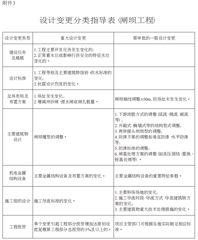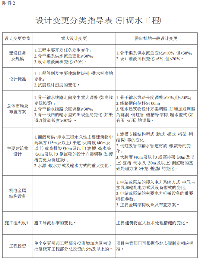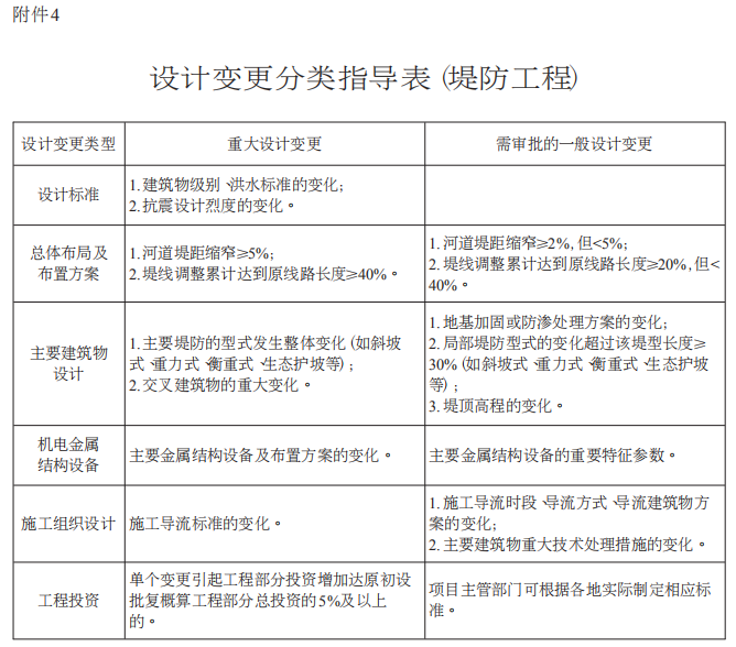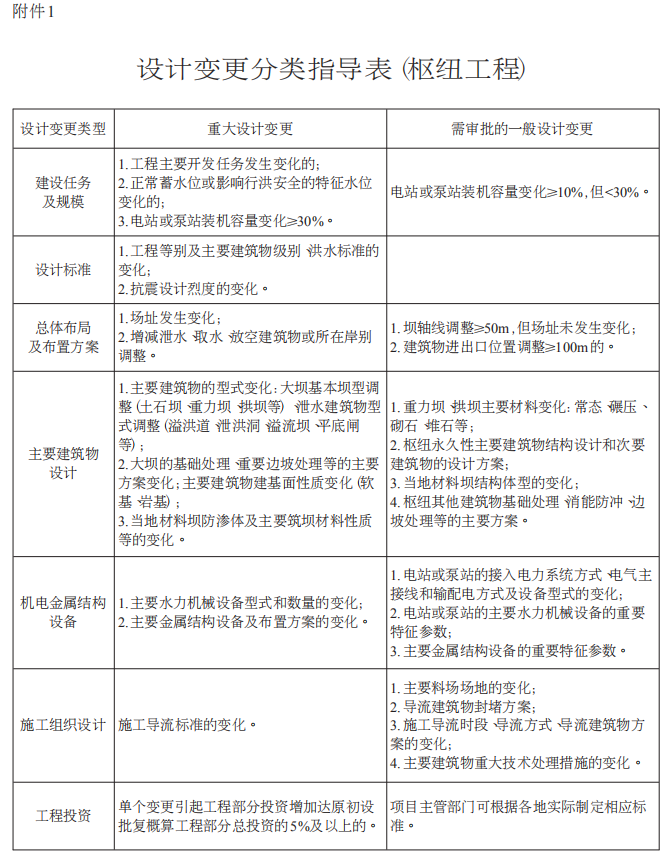 第六条 水利工程设计变更按设计变更的性质、规模及影响程度等,分为重大设计变更和一般设计变更。设计变更的分类参照附件划分,界定不清的由原初步设计审批部门界定。