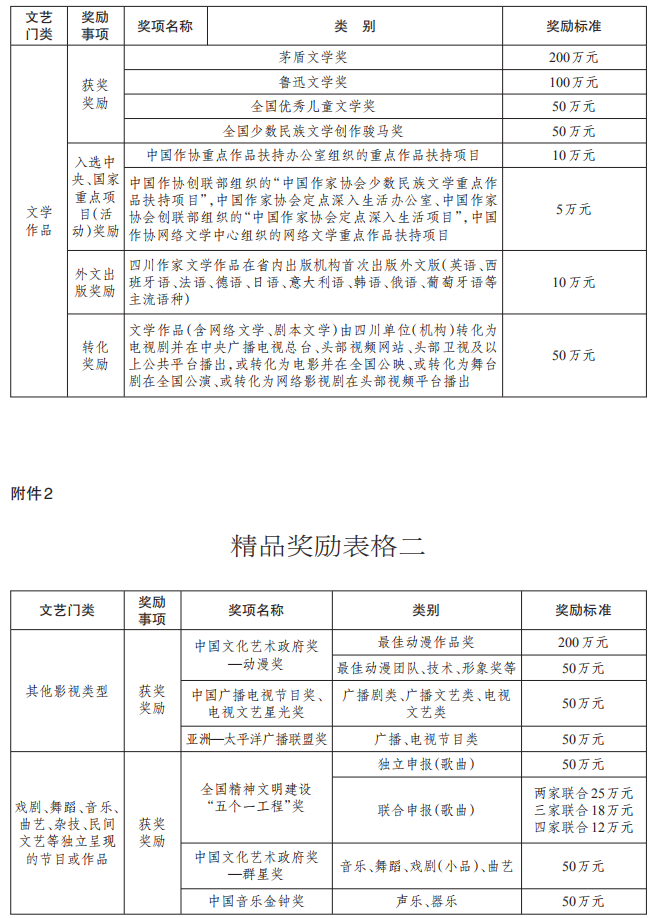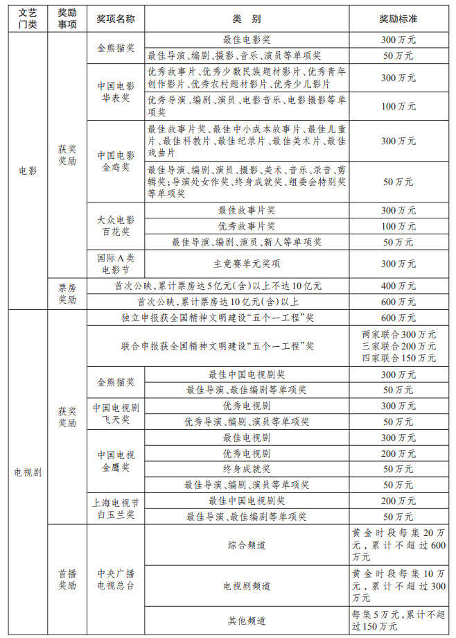 第十一条 对电影、电视剧、舞台剧、广播电视节目、网络影视剧、文学作品,按精品奖励表格一中的条件和标准予以奖励(见附件1)。