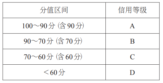 第十九条 “信用评价系统”根据综合信用评价得分自动确定工程造价咨询企业和注册造价工程师的信用等级,由高到低依次分为A、B、C、D四级。