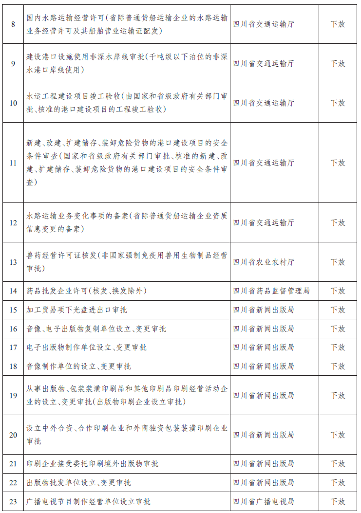 经研究,决定由省直有关部门(单位)下放成都高新区管委会、天府新区成都管委会、成都市双流区人民政府、成都市青白江区人民政府和中国(四川)自由贸易试验区川南临港片区管委会实施23项省级管理事项。下放事项自2021年3月1日起生效,由承接主体实施。
