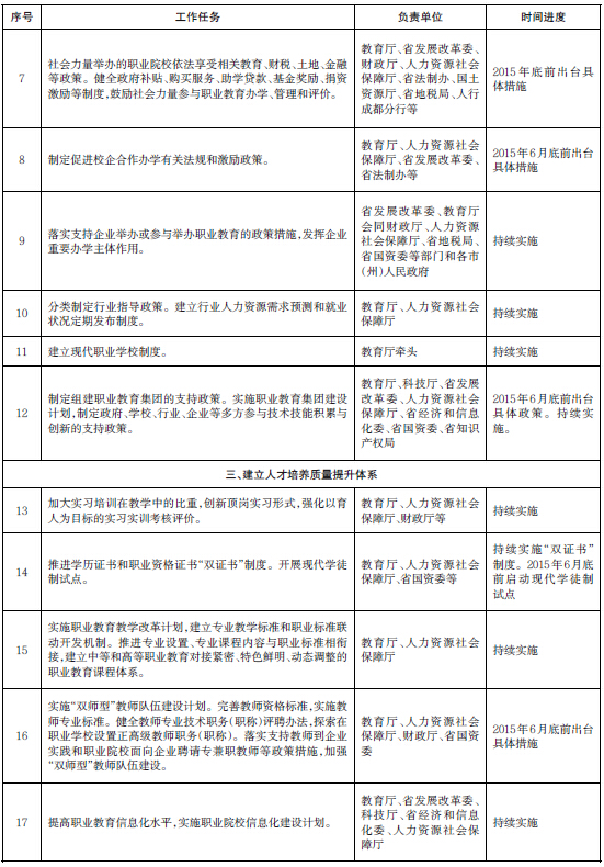 (一)制定加快发展现代职业教育的地方性法规体系。根据修订后的《职业教育法》制定地方性法规,明确各级人民政府的职责,规范职业院校、行业、企业等办学主体的权利义务,将职业教育体系建设的成果法制化。制定促进校企合作和职业教育集团化发展的地方性法规。