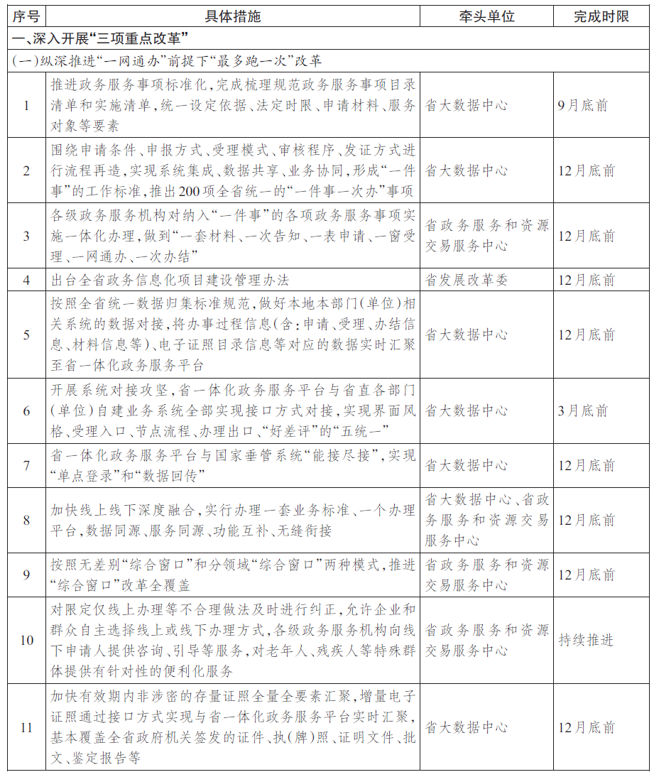 (一)纵深推进“一网通办”前提下“最多跑一次”改革。推进政务服务事项标准化,9月底前完成梳理规范政务服务事项目录清单和实施清单,统一设定依据、法定时限、申请材料、服务对象等要素。优化再造业务流程,推出200项全省统一的“一件事一次办”事项。开展系统对接攻坚,3月底前省一体化政务服务平台与省直各部门(单位)自建业务系统全部实现接口方式对接,12月底前与国家垂管系统“能接尽接”,实现“单点登录”和“数据回传”。加快线上线下深度融合,统一业务标准、办理平台,实现政务服务大厅“综合窗口”改革全覆盖。加强电子证照和电子印章的汇聚、管理和应用,推进全省政府机关签发的证件、执(牌)照、证明文件、批文、鉴定报告等电子化,10月底前凡已在省一体化政务服务平台汇聚的电子证照,不再要求申请人提供实体证照,12月底前推出200项“一证(照)通办”事项。