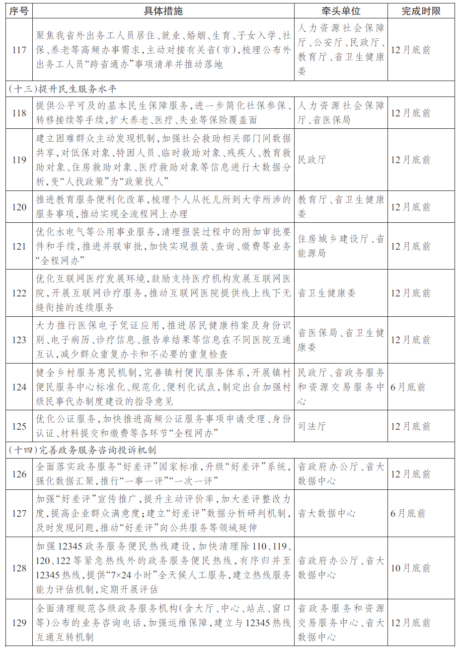 (十二)加快推进“省内通办”“跨省通办”。梳理公布“省内通办”清单,不断推进更多政务服务事项“省内通办”。开展政务服务流程再造“百日冲刺”行动,规范“异地代收代办”“多地联办”事项的业务规则和操作规程,推动各级政务服务机构均可异地受理不同层级行使的事项。推动政务服务“跨省通办”,在国家“跨省通办”事项清单基础上,聚焦我省外出务工人员居住、就业、婚姻、生育、子女入学、社保、养老等高频办事需求,主动对接有关省(市),梳理公布外出务工人员“跨省通办”事项清单并推动落地。