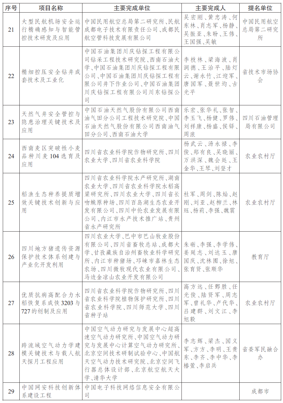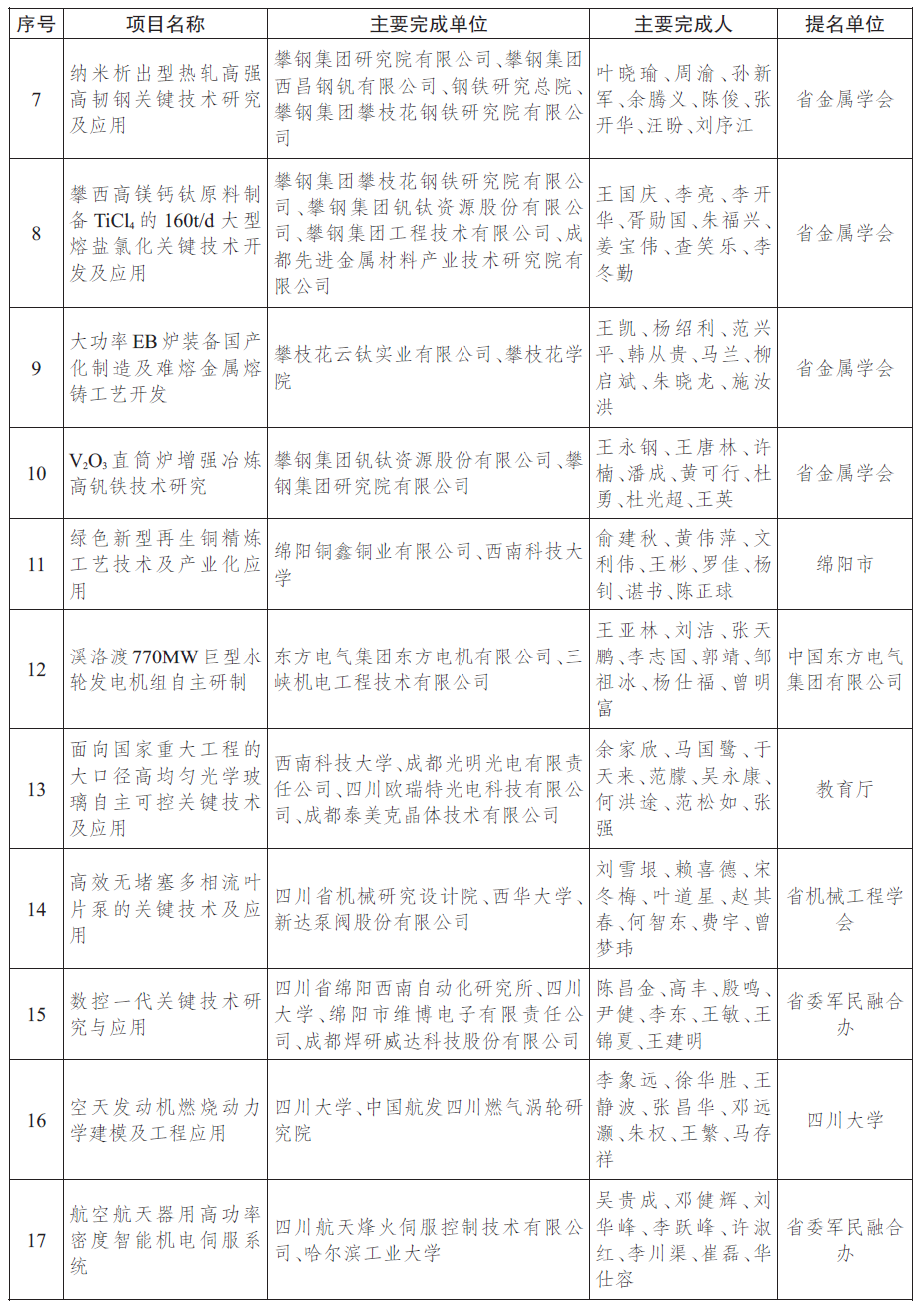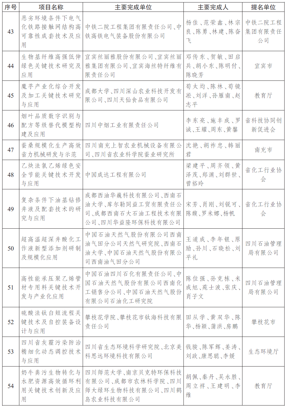 根据《四川省科学技术奖励办法》,经省科学技术奖励评审委员会评审、省科学技术奖励委员会审定,省政府批准授予四川大学冯小明教授四川省科学技术杰出贡献奖;授予“微纳结构化智能高分子材料的可控构建与性能强化机制”等36项成果四川省科学技术进步奖一等奖,授予“锂硫族电池隔膜与正极设计及电化学性能增强方法与机理研究”等80项成果四川省科学技术进步奖二等奖,授予“高性能有机光电材料设计及器件构建”等147项成果四川省科学技术进步奖三等奖;授予马丁·毕比(MartinBeeby)、特奥尔多·乌特鲁斯·约翰内斯·冯·阿什(TheodoorWouterusJohannesvanAsch)国际科技合作类奖。