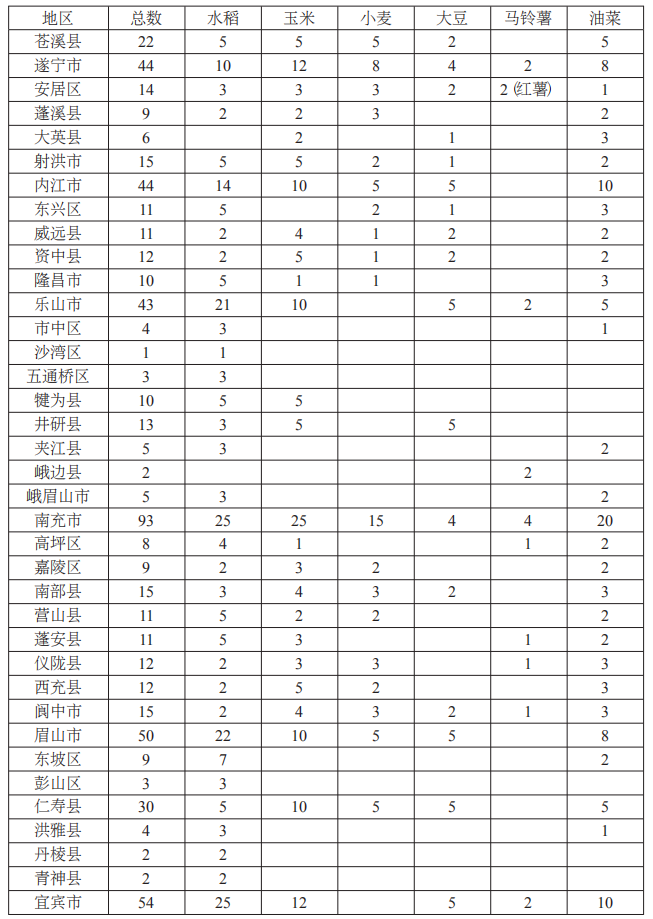 按照“相对固定县、滚动发展片”的思路布局,突出主要作物、重点产区、特色优势,确定“天府粮仓·百县千片”作物种类和建设范围。2024年在115个县建设1000个粮油千亩高产片(见附件)。