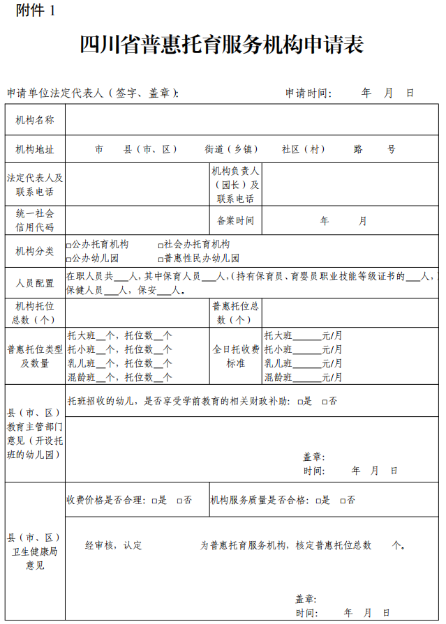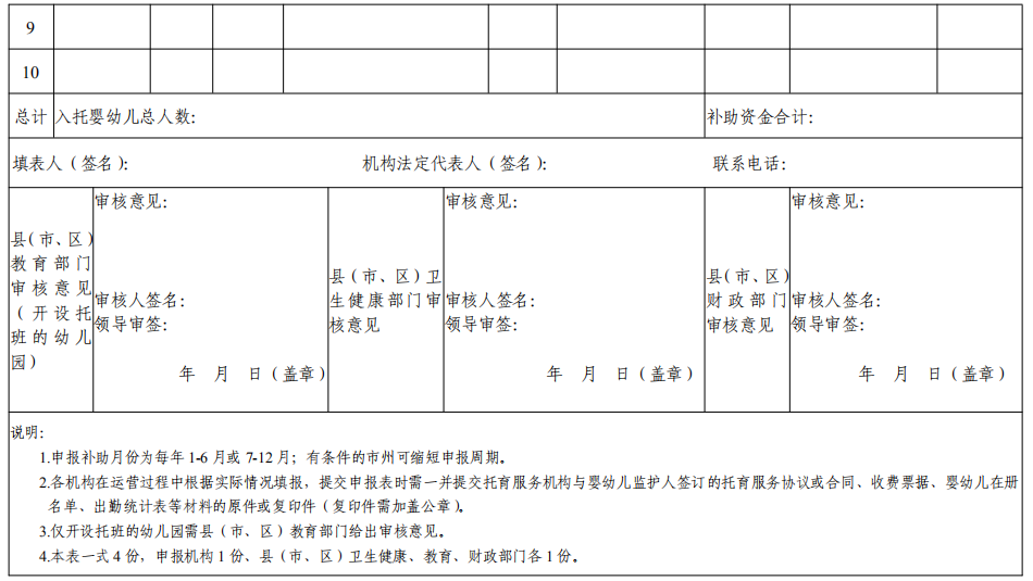 (一)机构申报。经认定的普惠托育服务机构,于每年7月15日和次年1月15日前,向属地县级卫生健康主管部门分别提交当年1月至6月和上年7月至12月的运营补助申请表、收费凭证、婴幼儿出勤记录表等材料。