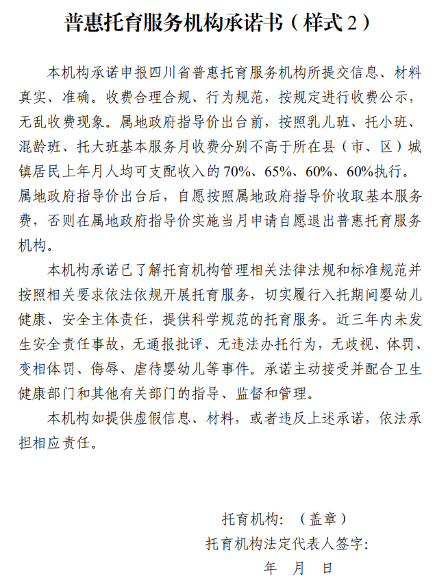 (一)自愿申请。自评符合条件的托育服务机构,自愿向属地县级卫生健康主管部门书面申请,提交普惠托育服务机构申报表、收费凭证、承诺书等材料。
