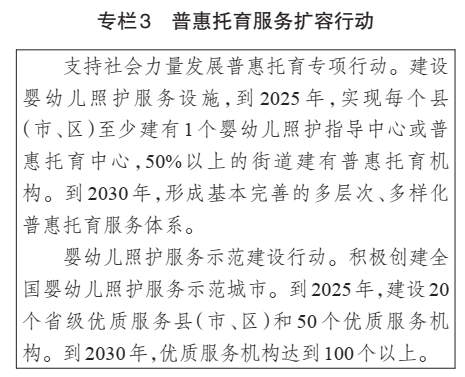 增加普惠托育多元供给。大力提升公办机构普惠托育服务质量,支持采取公建民营、购买服务等方式运营。鼓励有条件的用人单位为职工提供托育服务。促进家庭托育点规范健康发展,拓展家政企业育儿服务,支持有条件的幼儿园开设托班招收2至3岁幼儿。完善隔代照料、家庭互助等照护模式,探索发展家庭育儿共享平台、互联网直播互动式家庭育儿服务等智慧托育新业态。积极创建全国婴幼儿照护服务示范城市。