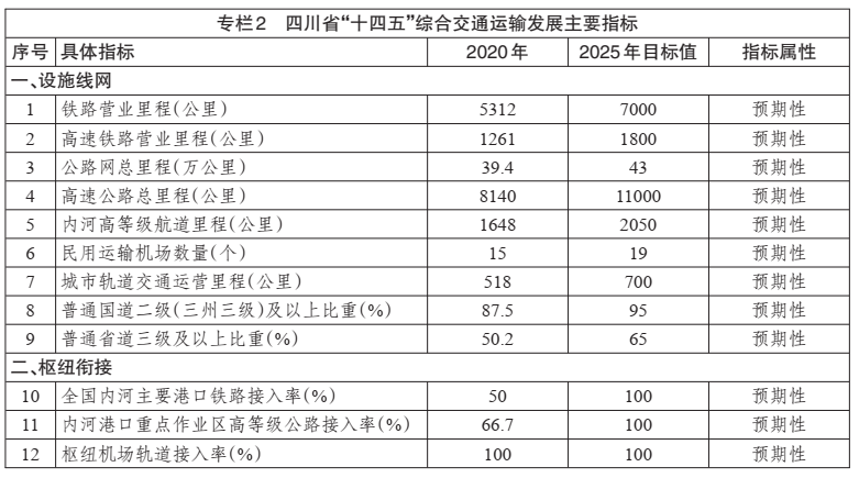 高速公路。加快完善以进出川大通道为核心、城际互联为重点、县域覆盖为目标的高速公路网络。加密川黔、川滇、川陕、川渝省际通道,力争高速公路进出川大通道达到37条。推动高速公路向民族地区延伸,加快久马、九绵、沿江、西昭等国家高速公路待贯通路段建设。推进成渝、成绵广、成乐、成南、遂渝等交通繁忙路段扩能改造。推动城际高速公路建设,基本实现省内五大区域、区域内部城市之间直连直通。围绕成渝地区双城经济圈发展需求,规划研究一批高速公路项目,支持具备条件的项目适时启动建设。
