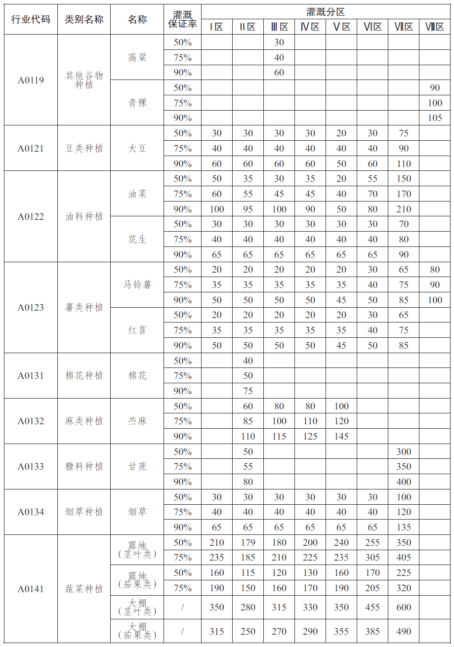 农业用水定额见表1~表5,具体灌溉分区情况见附录A。