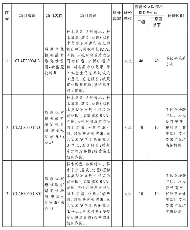 一、“病原体核糖核酸扩增定性检测-新型冠状病毒”项目价格调整至40元/人次,“病原体核糖核酸扩增定性检测-新型冠状病毒(5混1)”项目价格和“病原体核糖核酸扩增定性检测-新型冠状病毒(10混1)”项目价格统一调整至10元/人次(详见附件),价格不区分医疗机构等级。