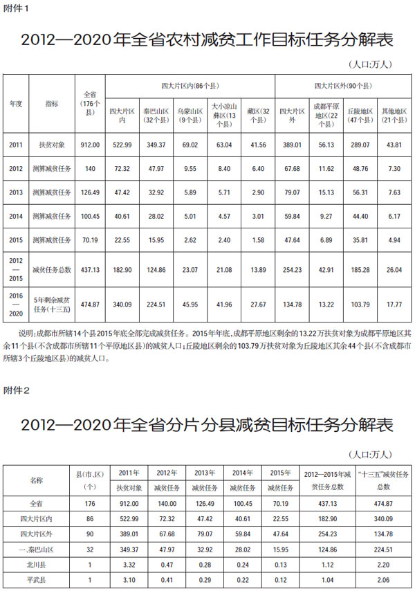 (一)2012—2015年减贫任务。2012年扶贫对象减少140万人,其中《纲要》确定的“四大片区”86个县(以下简称“四大片区”县)减少72.32万人、片区外90个县(以下简称片区外县)减少67.68万人;2013年扶贫对象减少126.49万人,其中“四大片区”县减少47.42万人、片区外县减少79.07万人;2014年扶贫对象减少100.45万人,其中“四大片区”县减少40.61万人、片区外县减少59.84万人;2015年扶贫对象减少70.19万人,其中“四大片区”县减少22.55万人、片区外县减少47.64万人。成都市所辖平原地区和丘陵地区的14个县(市、区)“十二五”期间全面完成2300元以下扶贫对象减贫任务。