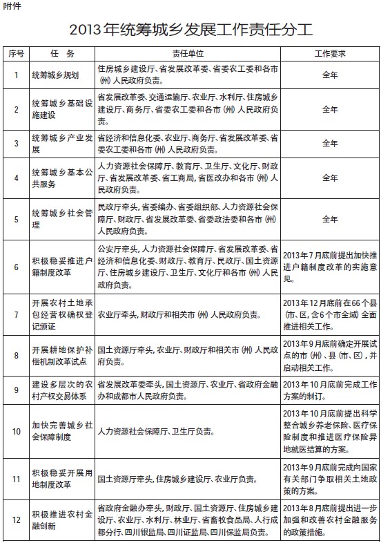 (一)落实责任分工。各地、各部门要将统筹城乡发展工作纳入重要议事日程,按照责任分工切实抓好落实。市(州)要建立完善责任机制,省直相关部门(单位)要确定分管负责人及承办处室。
