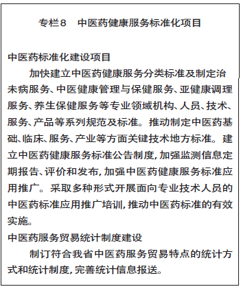 ——优化中医药健康服务发展环境。到2020年,中医药健康服务产业政策基本健全,行业规范和标准体系完善,中医药服务型人力资源优势更加突出,形成地方特色鲜明、文化氛围浓、创新活力强、行业自律好、政府监管有效的发展环境。
