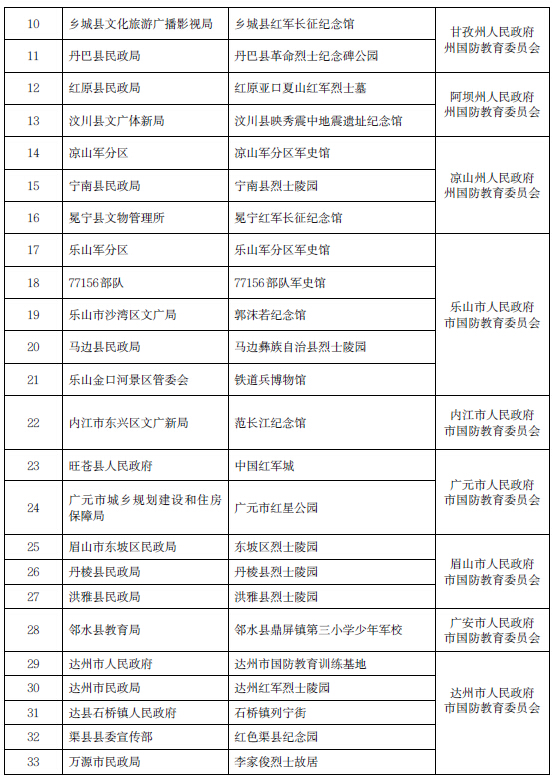 各市(州)人民政府,省政府各部门、各直属机构: 根据《中华人民共和国国防教育法》、《四川省国防教育实施办法》、《国防教育基地命名管理办法》等法律法规和规章,经研究,省政府同意命名成都市烈士陵园等37个单位为第三批省级国防教育基地。